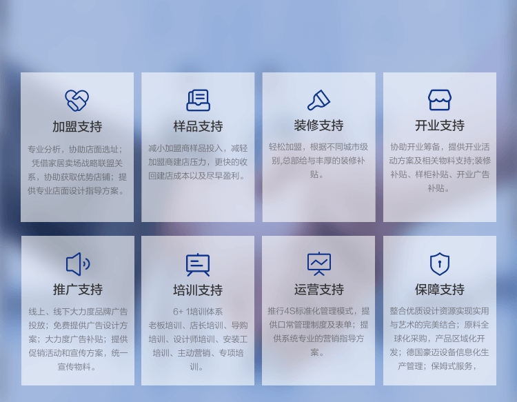 协助开业筹备,提供开业活动方案及相关物料支持;装修补贴、样柜补贴、开业广告补贴。